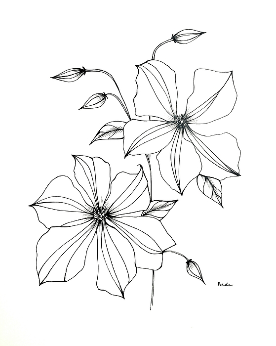 Two large, intricately detailed flowers with multiple petals are sketched in black and white, accented by small buds on slender stems. The linework is elegant and the simplicity highlights the beauty of the floral forms.
